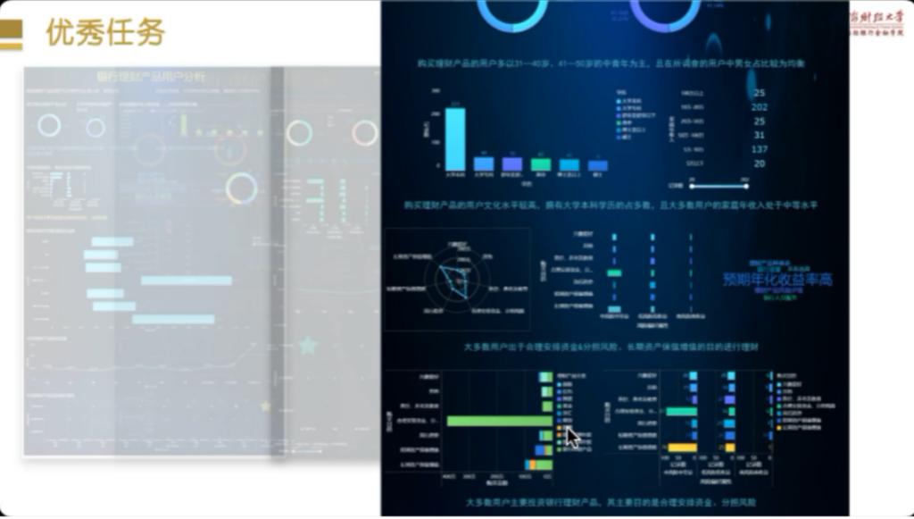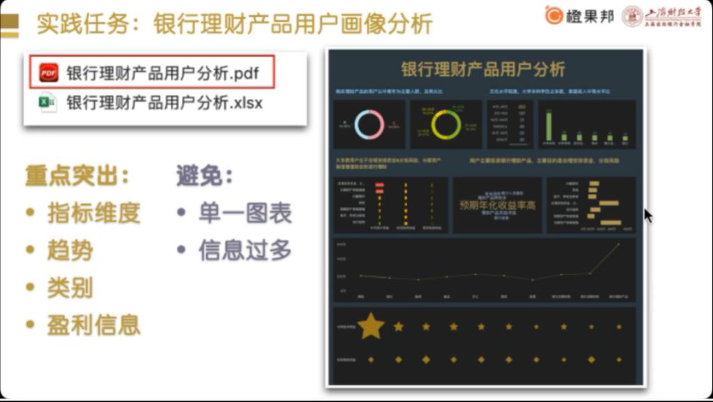 首先,李老师从数据分析流程、模型以及FineBI工具的运用等方面对整个毕业实习内容进行回顾总结,并通过银行理财产品用户画像分析案例强调数据分析在于从指标维度、趋势、类别和盈利信息四个角度进行重点突出,而不是呈现出所有信息,同时告诫员工要避免单一图表和信息过多问题的出现,应换位思考,简要而清晰地表达数据分析报告。