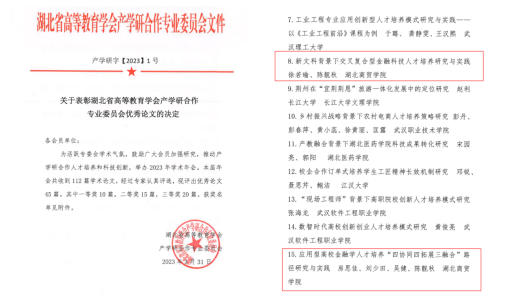 在刚刚落幕的湖北省高等教育学会产学研合作专业委员会2023年学术年会论文征集中,申博SUNBET徐若瑜、房思佳、张盼三位教师入选年会论文集,其中徐若瑜等老师的《新文科背景下交叉复合型金融科技人才培养研究与实践》、房思佳、吴健等老师的《应用型高校金融学人才培养“四协同四拓展三融合”路径研究与实践》两篇论文获评优秀学术论文二等奖。