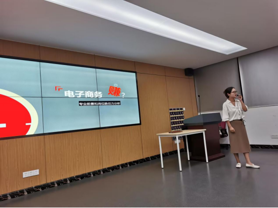 讲座初始,主持人孟静副经理就本次讲座致开场辞,对主讲人陈佩进行介绍并表示热烈欢迎。随后,陈佩从电子商务专业就业前景、岗位划分、就业心态、就业寄语四个方面为同学们进行了全方位讲解,帮助同学们梳理当前电子商务专业就业前景及岗位需求,并细化到市场类、管理类、技术类等具体电商岗位。详细介绍网站推广、电商运营、网页制作等岗位能力要求及对应的薪资待遇。同时,陈佩主管还结合员工就业工作中需具备的十二项就业能力及就业心态进行深入分析。讲座最后,陈佩与同学们进行答疑互动,解决同学们面对就业存在的困惑。