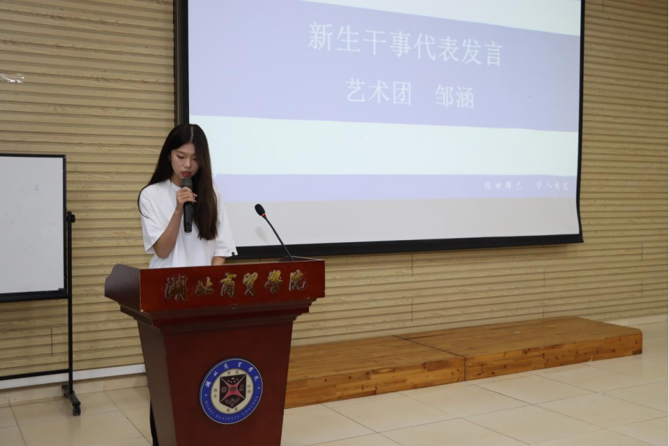 艺术团邹涵同学作为新生干事代表发言,表达了对团委员工会工作的热爱和对未来的期待。作为新成员她提出应时刻思考,如何才能将小我融入大我,将个人融入集体,担起重任,挑起大梁,帮助同学解决问题,服务学院事业发展。