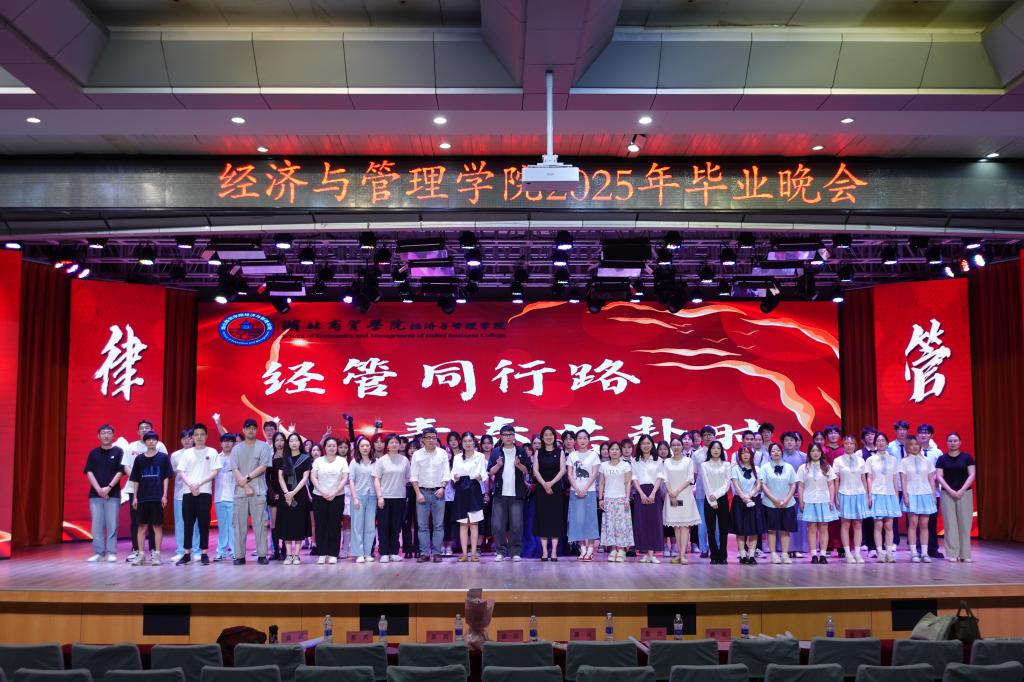 晚会尾声,全体人员齐聚舞台合影留念。随着相机快门声响起,2025届毕业生的青春篇章被永久封存。这场晚会不仅是告别,更是新征程的号角。正如主持人所言:“愿经管学子带着‘经世律己,管人悟道’的初心,在时代的浪潮中书写属于这一代人的答卷!”