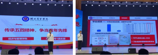 全场压轴出场的22营销专1班团支部,汇报主题为“传承五四精神,争当青年先锋”。汇报人匡文静同学介绍到,支部注重支部建设、学风建设,支部成员积极参与各类活动,在各个领域取得多项成果,展示了新时代青年的风采。