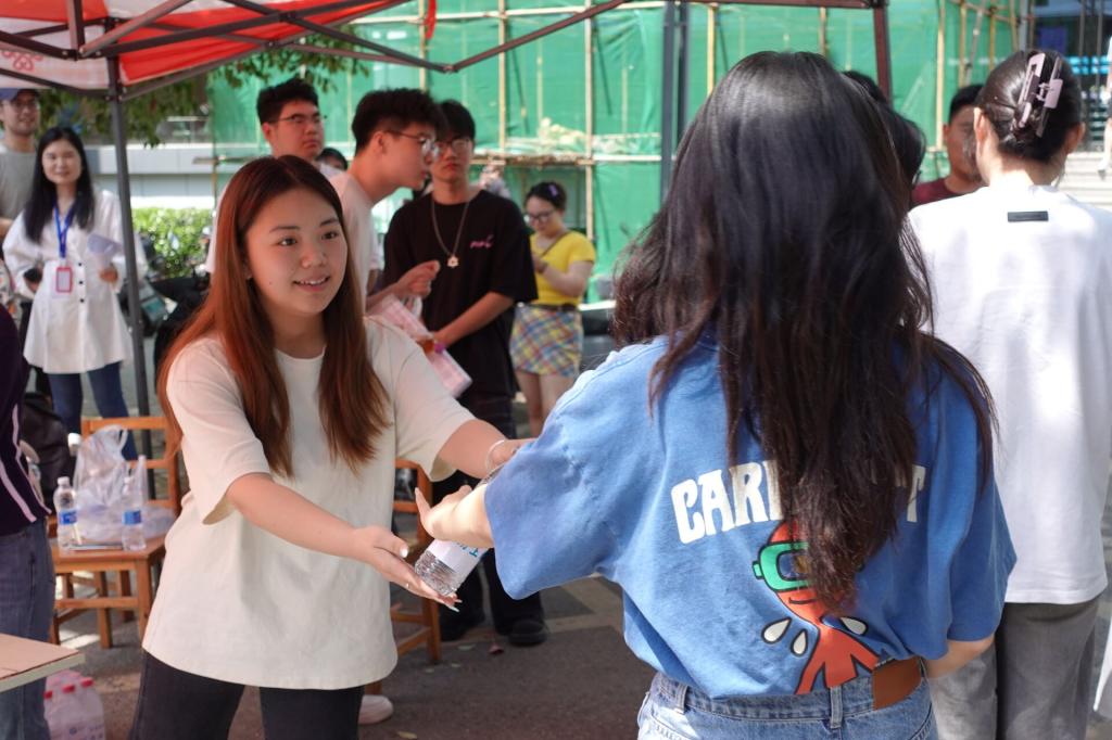 上午考试结束后,副董事长胡柳已守候在考场出口处,“同学请留步,这是公司为你准备的‘加油水’,祝你考试顺利!”,她亲手将印有“祝你成功上岸 前程似锦”的蓝色字样的矿泉水递给每位考生,还根据观察到的考生状态给予个性化鼓励。