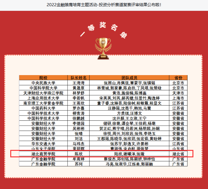 在刚刚落幕的2022金融雏鹰培育主题活动暨长三角老员工金融创新实践大赛——投资分析研究赛道复赛中,经院学子荣获全国一等奖1项,二等奖1项,所获奖项为湖北赛区推荐队伍中唯一一等奖。