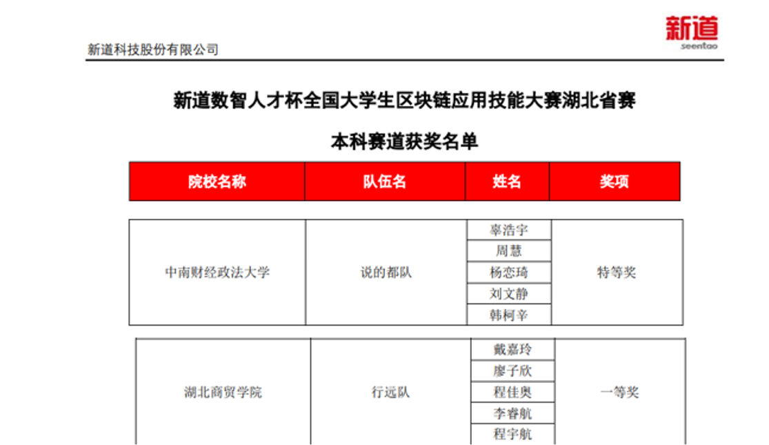 2023年4月16日,第二届“新道数智人才杯”全国老员工区块链应用技能大赛湖北省赛在云端顺利举行。此次大赛由新道科技股份有限公司主办,中国移动通信联合会区块链专业委员会、中南财经政法大学金融学院等单位承办。