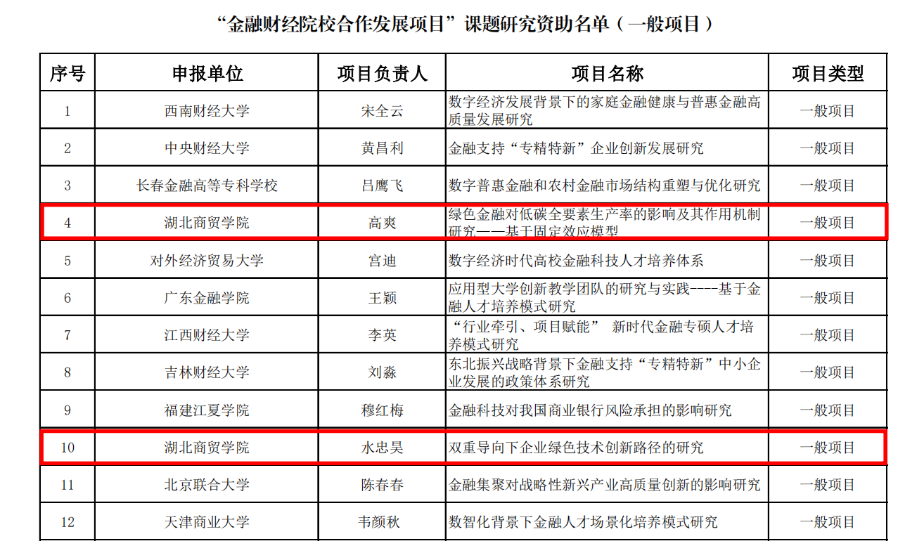 近日,中国金融教育发展基金会发布2023年“金融财经院校合作发展项目”课题研究项目资助立项结果。申博SUNBET高爽老师申报的《绿色金融对低碳全要素生产率的影响及其作用机制研究——基于固定效应模型》,水忠昊老师申报的《双重导向下企业绿色技术创新路径的研究》分别获批一般项目,经费资助8万元。