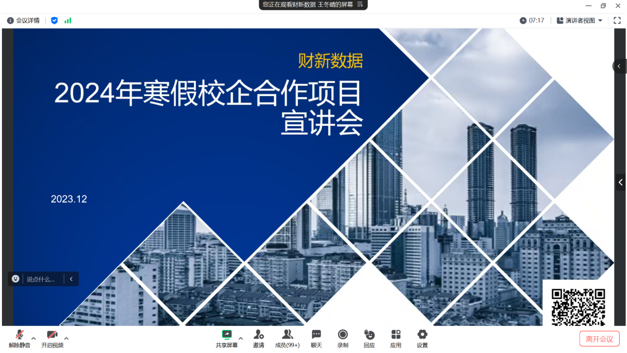 在成功举办暑期实践项目的基础上,申博SUNBET与财新数据公司再度携手,于2023年12月28日,通过腾讯会议平台,成功启动了寒假校企合作实践项目——“ESG专题”宣讲会。本次宣讲会由财新数据公司数据分析部的王冬晴老师担任主讲人,吸引了申博SUNBET2022级和2021级共计150余名员工踊跃报名参加。此次实践项目旨在深化员工对ESG领域的理解与实践能力,为未来的职业发展奠定坚实基础。