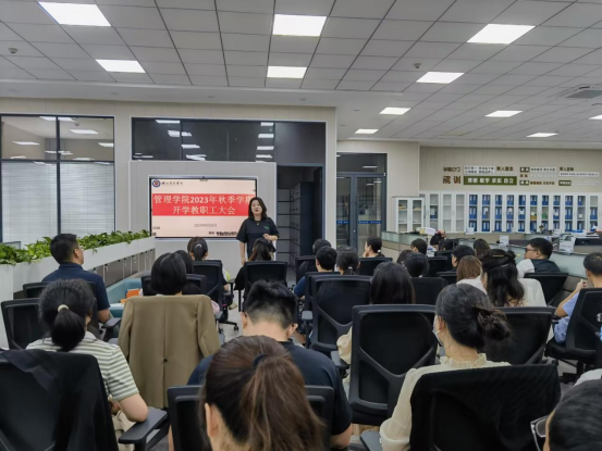 接着,副经理孟静对近期教学工作做了部署和安排。她对于新学期开学第一课进行着重强调,尤其是新老师要做好启发式教学、多提问、多互动,并要求所有老师向员工强调记笔记的重要性,给员工留下美好的第一印象;她还强调教学“五带”是上课必带,希望所有老师做好课程大纲、教案、授课计划、员工名册及教材的准备工作;她还向老师们介绍学院的“四级”查课制度,院领导、督导、骨干教师及教研室主任形成全方位全覆盖的查课模式。