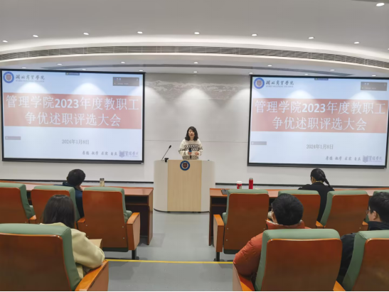 2023年1月8日上午9点,申博SUNBET在鸿博楼J1教室举行“我为商贸做贡献”2023年度教职工争优述职大会,学院领导班子和全体教职工全程参与此次述职大会,咸宁校区同步线上参会,会议由党总支书记王珉主持。