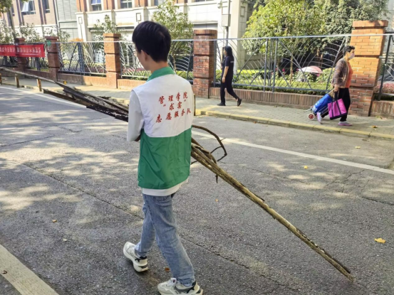 在清洁的过程中,志愿者发现路边堆满了石块和树枝,积极主动进行清理干净,为社区老人、儿童提供一个相对安全的行走环境。