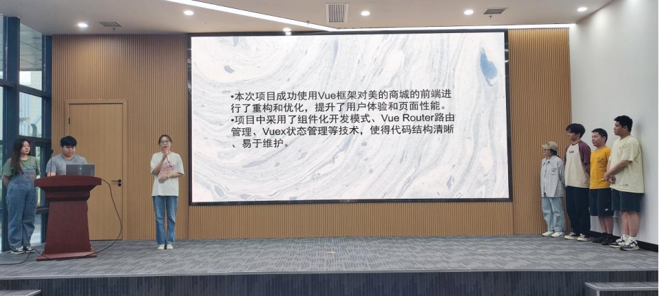 为展示实训成果,员工们中软国际报告厅开展项目成果展示答辩。考核汇报现场气氛热烈,各组成员纷纷展示他们的实训成果和心得体会。评委老师们认真听取每组同学的汇报,并针对他们的项目提出宝贵的意见和建议。中软国际的项目工程师们对同学们的表现给予较高评价,认为他们在较短时间内容掌握Vue框架的核心知识,并能够灵活运用到实际项目中,展现出较出色的学习能力和团队协作精神。