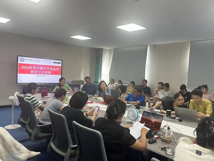 随后,孟静对近期的教学工作进行了部署和安排。她详细说明论文整改及开学前的各项准备工作。此外,她还特别提醒各位老师要注意教学“五带”——课程大纲、教案、授课计划、员工名册及教材,希望所有老师做好充分准备,另外,她还对新学期教学各项工作进度安排及教研活动进行介绍。