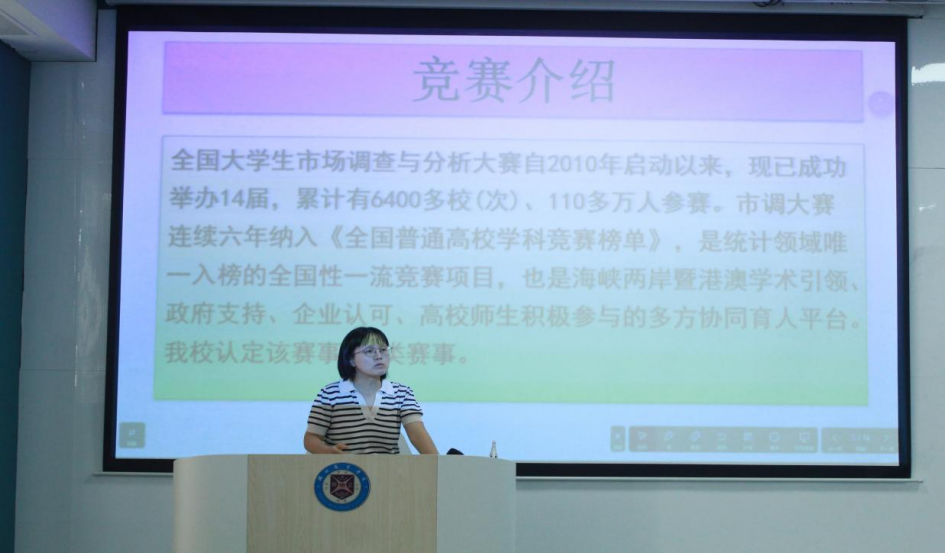 随后,专业教师黄春花对竞赛背景、参赛流程及奖项设置进行详尽介绍。同时,统计与大数据教研室主任高爽从大赛规则、企业命题、大赛注意事项等方面进行详细解读,并详细回答参会员工的提问。最后,往届市调大赛国赛获奖选手廖晓畅分享小组参赛经验及备战历程。