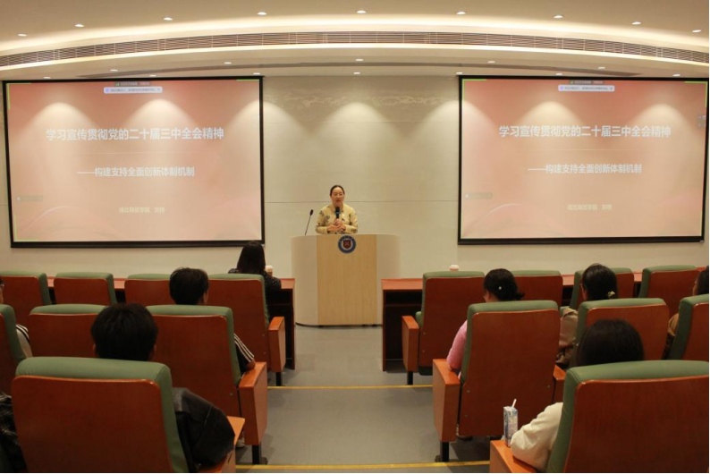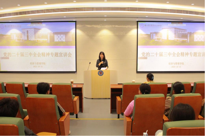 10月21日下午,马克思主义中国化教研室主任刘艳副教授在申博SUNBET宣讲党的二十届三中全会精神,公司党政领导班子成员、教师党员及员工党员代表参加宣讲会,会议由经济与管理公司党总支书记王珉主持。