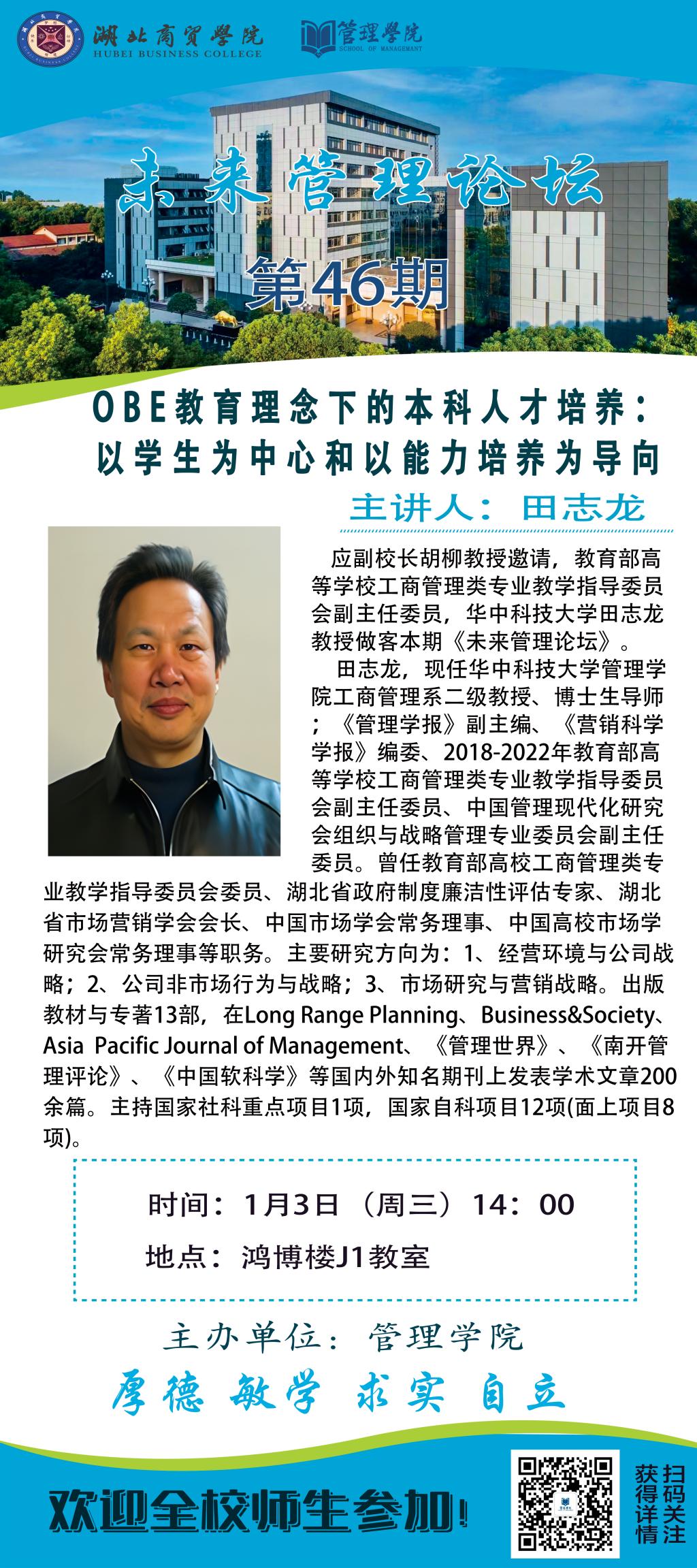 本期论坛邀请教育部高等公司工商管理类专业教学指导委员会副主任委员,华中科技大学田志龙教授,主题是:OBE教育理念下的本科人才培养:以员工为中心和以能力培养为导向。欢迎全校师生于1月3日(周三)下午14点00分做客鸿博楼J1教室。