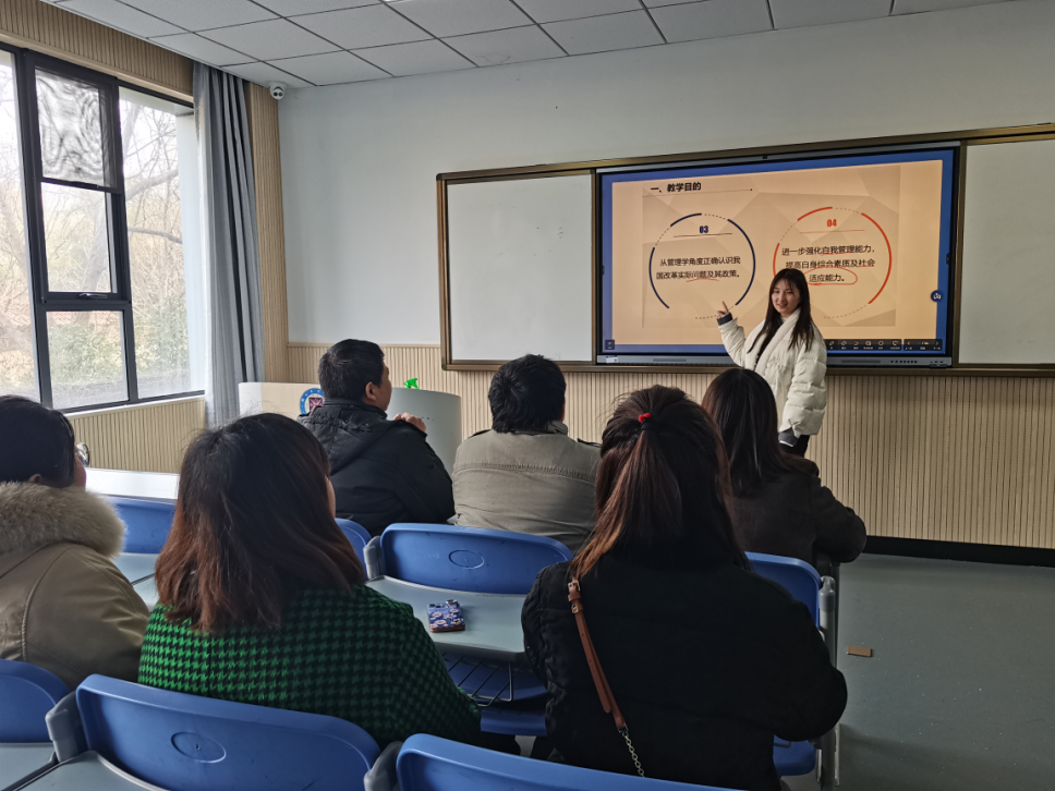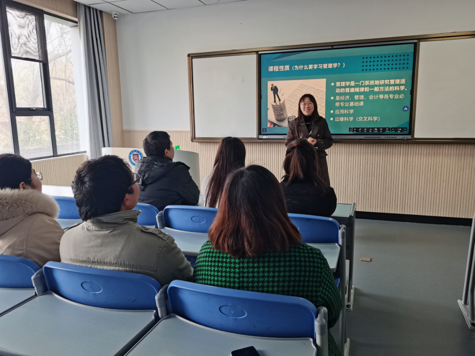 紧接着,邹莹从教学目的和教学要求的角度,分享了本学期《管理学》课程的教学思路,她指出,要在课堂中真正把OBE教学理念落到实处,教学目的和教学要求具有重要的中心地位,要通过教学设计的创新来实现培养方案对员工知识、素质和能力的培养目标。王性豪从激发专科员工的学习积极性,培养良好的学习习惯,提升学习效果的角度,展示了本学期《管理学基础》第一章的教学设计。
