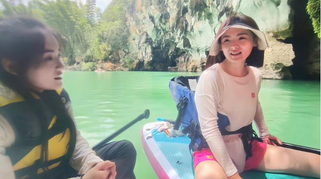 桨板逐碧波,人在画中游。河面上,桨板划水声、笑声交织荡漾,桨板爱好者们身着水母服或救生衣,与水亲密接触,畅意滑行,尽情享受水上乐趣,领略大小井风景区美丽的自然风光。耳边的风息,仲夏的蝉鸣,碧绿的流水,让人不由得发出一声声感叹“夏天就是要玩水呀!”浆板项目作为当地必不可少的体验内容,在这炎炎夏日同样吸引了不少游客前来尝试体验,作为客流量相对集中的区域,实践小分队将目光投向这里,并在划桨板的体验过程中随机采访了一些体验者。团队成员了解到这位游客来自广东深圳,她表示是从一些社交平台上了解到贵州罗甸特色旅游景点所以才会前来,并且对当地的人土风情给出了极高的评价,她认为这里民风纯朴善良,景色也十分宜人,浆板运动非常特别和刺激,带给她与以往旅游不一样的体。但是相对其他旅游景区,其游玩项目类别过于单一,除了浆板仅竹筏一个游玩项目,而游客更多仅仅用此来代步。