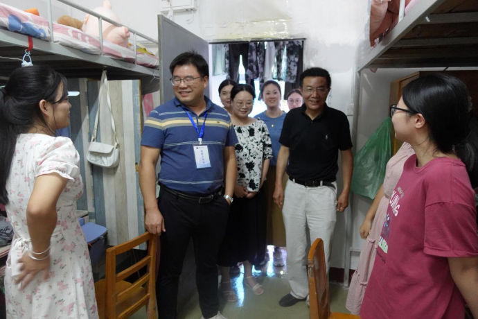 程胜军走访了新生寝室,与员工亲切交谈,询问同学们假期生活、返校感受及新学期的学习规划。领导们对寝室的卫生状况给予了高度评价,鼓励大家继续保持良好的生活习惯,共同维护干净整洁的住宿环境。