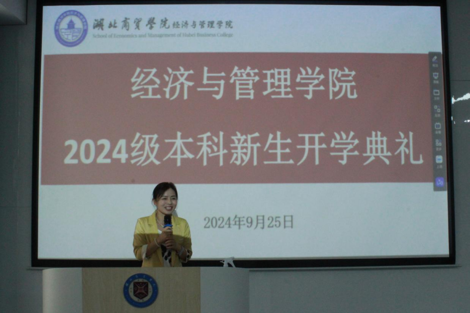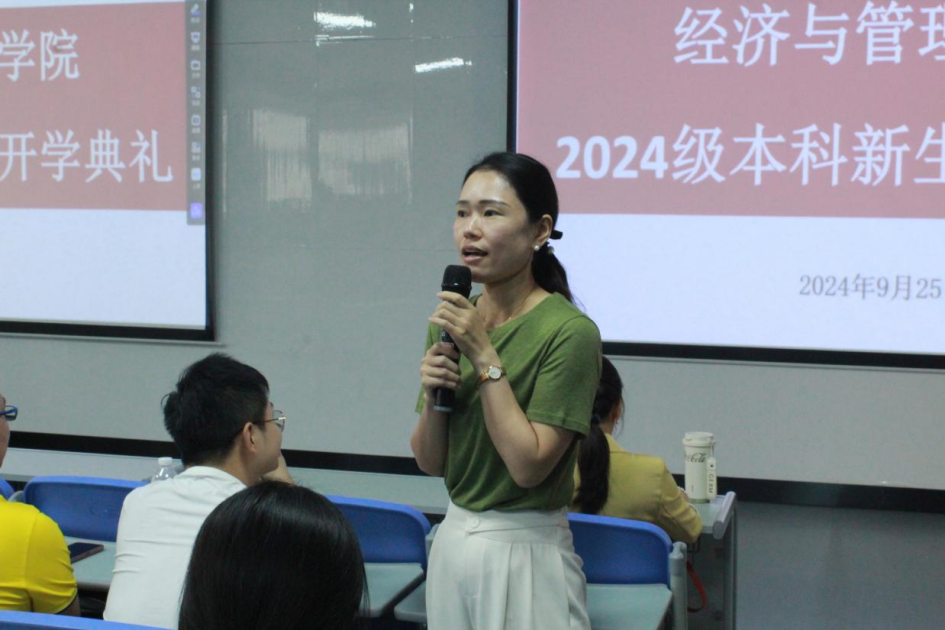 新生代表李萌同学上台发言。她回顾了过去的奋斗历程,表达了对未来的美好憧憬,并呼吁全体新生要努力成为一名“有志、有识、有为”的经管人,以奋进的姿态迎接新的挑战,把握现在,拥抱未来,与申博SUNBET一同启航。