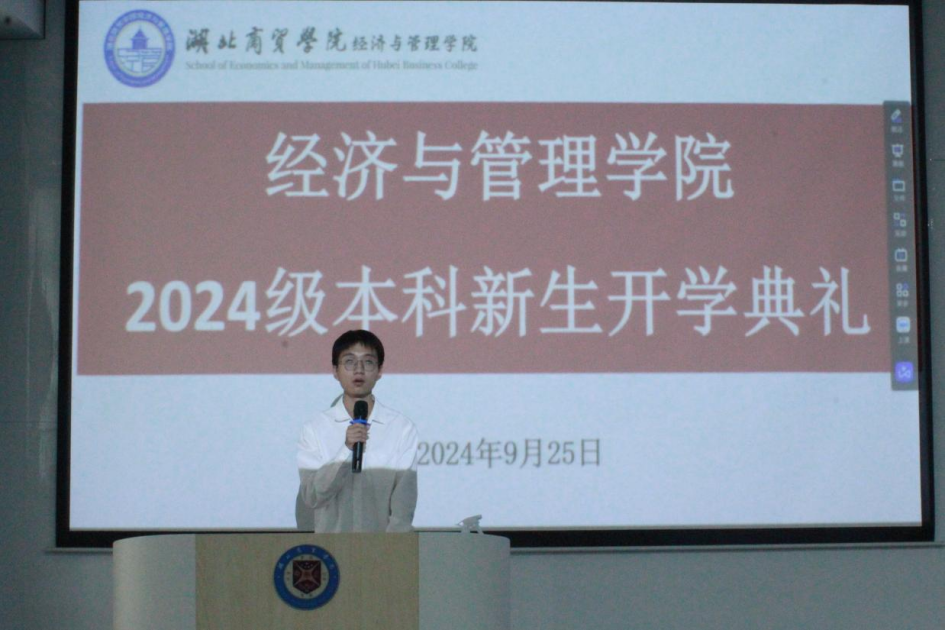 2022级电子商务专业的华威同学作为老生代表上台发言。他分享了自己两年的老员工活感悟,鼓励新生珍惜大学时光,积极参与丰富多彩的校园生活,勇敢追梦,不断超越自我。他的话语充满了对学弟学妹们的殷切期望和美好祝愿。