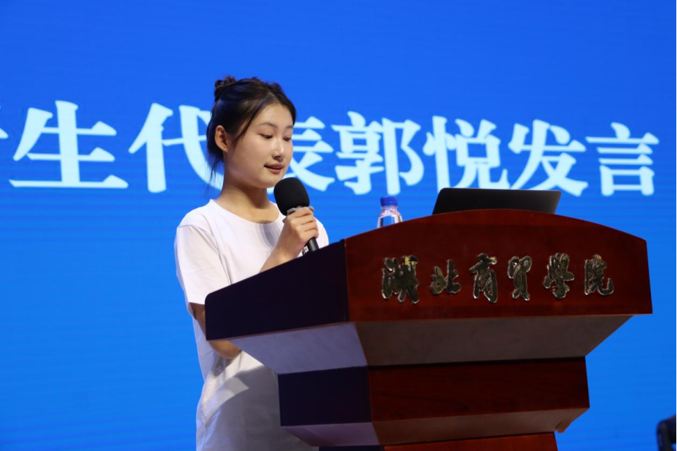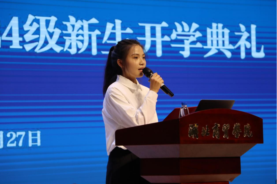 随后,2024级电子商务专业郭悦作为新生代表发言。她代表全体新生表达了对老员工活的向往和对专业知识的渴望,同时也承诺将珍惜时光,努力学习,为学院争光。