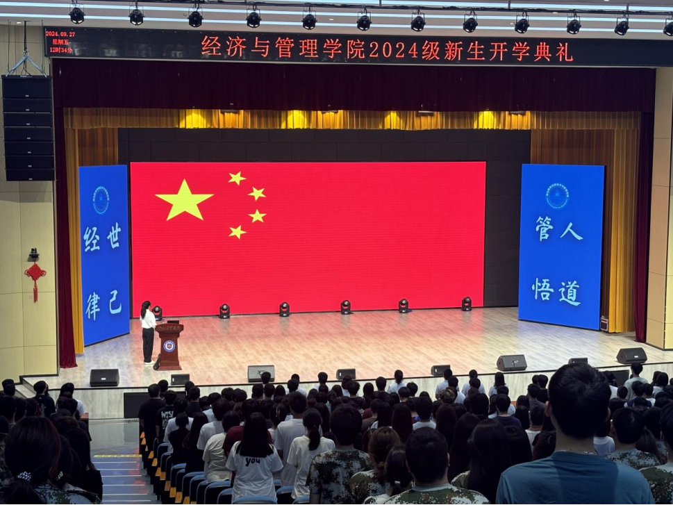 随着主持人23旅管专1班丁晓宇同学宣布典礼开始,全体人员起立,奏唱国歌。激昂的旋律在礼堂内回荡,展现了时代青年的爱国热血与昂扬斗志,也标志着新学年的正式开启。